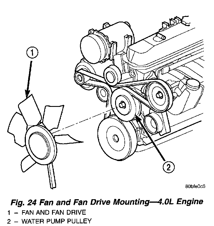 5. 4.0L Engine: The thermal viscous fan drive/fan blade assembly is attached (threaded) to water pump hub shaft. Remove fan blade/viscous fan drive assembly from water pump by turning mounting nut counterclockwise as viewed from front. Threads on viscous fan drive are RIGHT HAND. Using a suitable fan wrench loosen the fan drive.