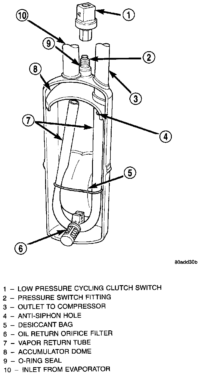 Refrigerant enters the accumulator canister as a low pressure vapor through the inlet tube. Any liquid, oil-laden refrigerant falls to the bottom of the canister, which acts as a separator. A desiccant bag is mounted inside the accumulator canister to absorb any moisture which may have entered and become trapped within the refrigerant system.