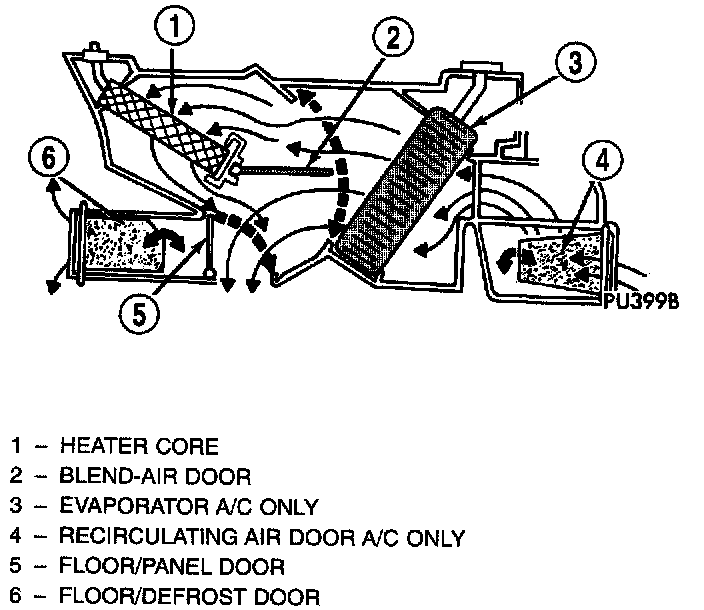 All vehicles are equipped with a common heater- A/C housing assembly. The system combines air conditioning, heating, and ventilating capabilities in a single unit housing mounted under the instrument panel. On heater-only systems, the evaporator coil and recirculating air door are omitted from the housing.