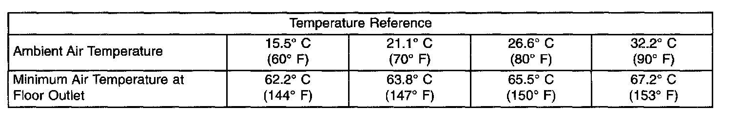 Engine coolant is delivered to the heater core through two heater hoses. With the engine idling at normal operating temperature, set the temperature control knob in the full hot position, the mode control switch knob in the floor heat position, and the blower motor switch knob in the highest speed position. Using a test thermometer, check the temperature of the air being discharged at the heater-A/C housing floor outlets. Compare the test thermometer reading to the Temperature Reference chart. Both of the heater hoses should be hot to the touch. The coolant return heater hose should be slightly cooler than the coolant supply heater hose. If the return hose is much cooler than the supply hose, locate and repair the engine coolant flow obstruction in the cooling system.
