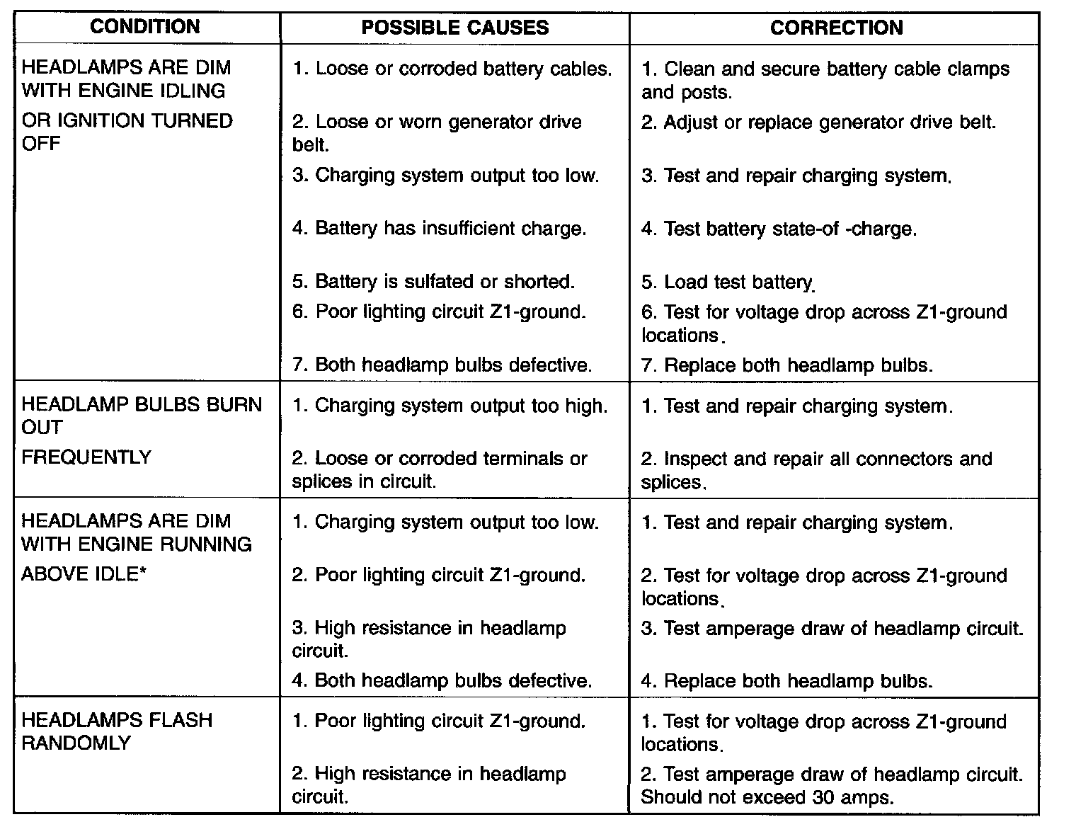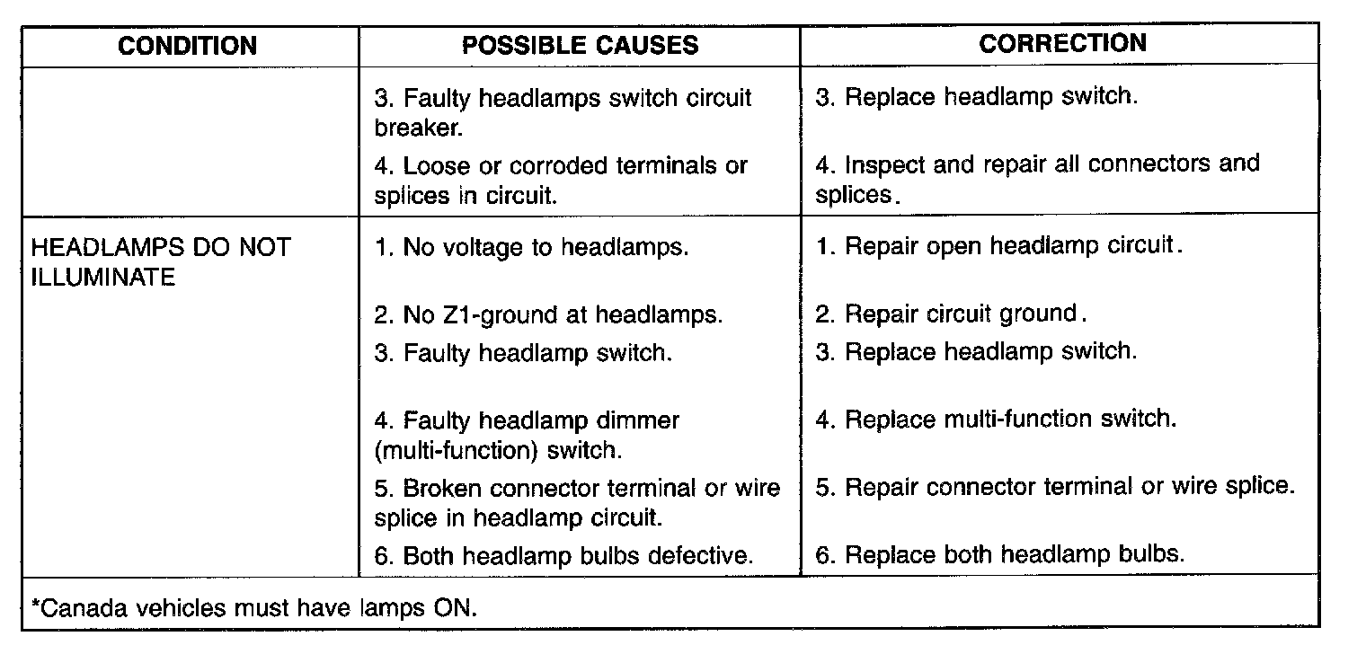 When a vehicle experiences problems with the headlamp system, verify the condition of the battery connections, fuses, charging system, headlamp bulbs, wire connectors, relay, high beam switch, dimmer switch, and headlamp switch.