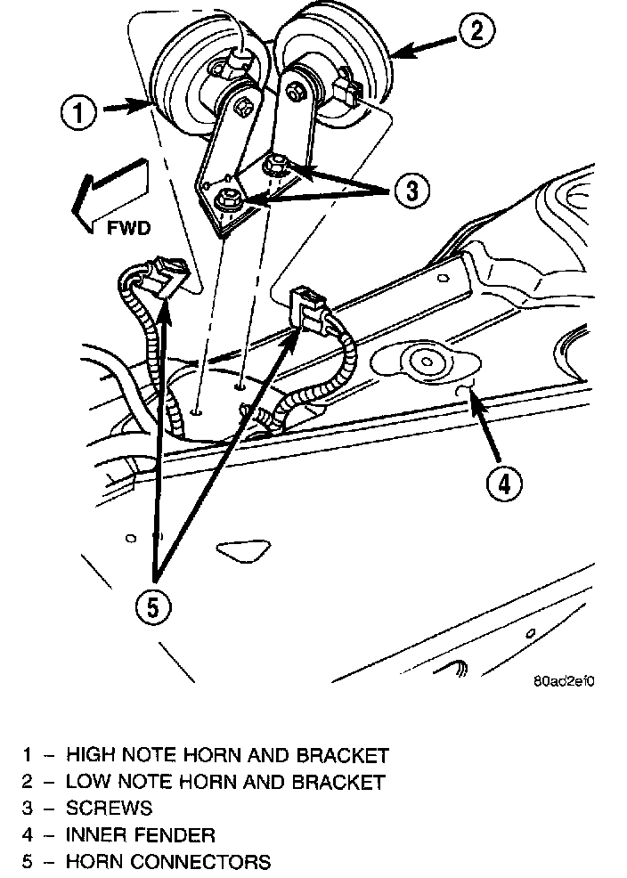 4. Remove the horn and mounting bracket units from the left front inner fender shield.