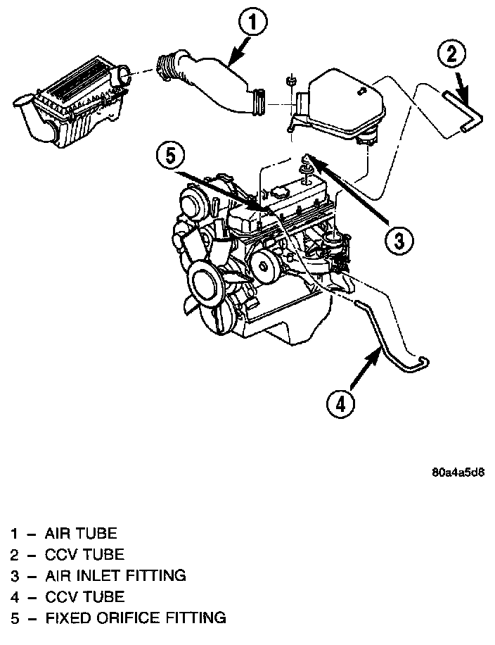 When the engine is operating, fresh air enters the engine and mixes with crankcase vapors. Manifold vacuum draws the vapor/air mixture through the fixed orifice and into the intake manifold. The vapors are then consumed during combustion.