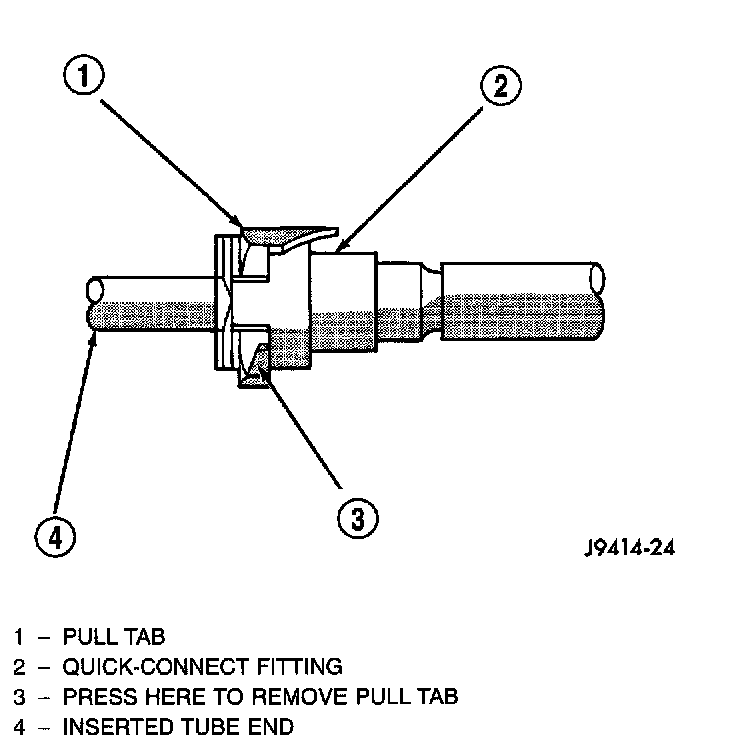 5. Two-Tab Type Fitting: This type of fitting is equipped with tabs located on both sides of fitting. The tabs are supplied for disconnecting quick-connect fitting from component being serviced.