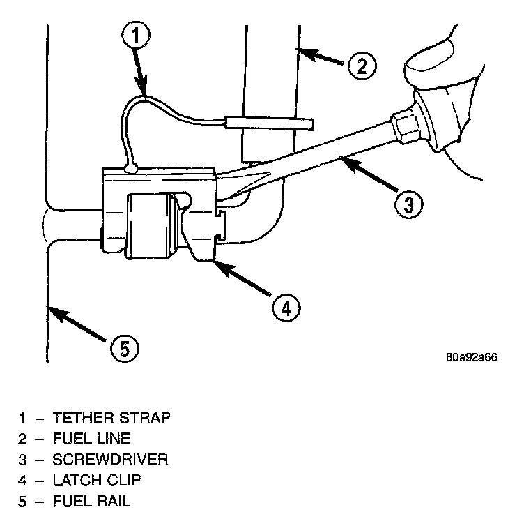 c. Slide latch clip toward fuel rail while lifting with screwdriver.