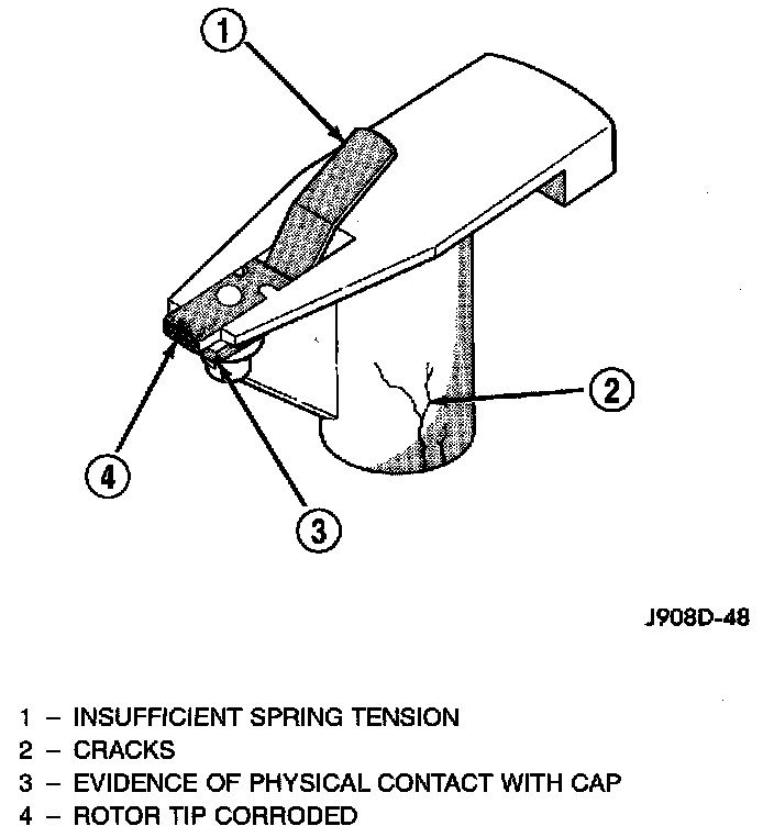 Visually inspect the rotor for cracks, evidence of corrosion or the effects of arcing on the metal tip. Also check for evidence of mechanical interference with the cap. Some charring is normal on the end of the metal tip. The silicone-dielectric varnish-compound applied to the rotor tip for radio interference noise suppression, will appear charred. This is normal. Do not remove the charred compound. Test the spring for insufficient tension. Replace a rotor that displays any of these adverse conditions.