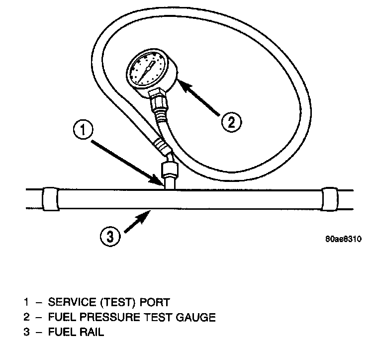 1. Remove protective cap at fuel rail test port. Connect the 0 - 414 kPa (0 - 60 psi) fuel pressure gauge (from gauge set 5069) to test port pressure fitting on fuel rail. The DRB III Scan Tool along with the PEP module, the 500 psi pressure transducer, and the transducer-to-test port adapter may also be used in place of the fuel pressure gauge.