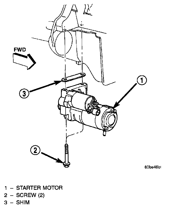 5. Position the starter motor and any starter motor shims that were removed during the starter motor removal procedure to the engine block. Loosely install the two starter motor mounting screws to secure the starter motor and shims to the engine block.