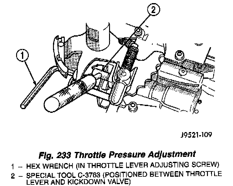 Insert Gauge Tool C-3763 between the throttle lever cam and the kickdown valve stem (Fig. 233).