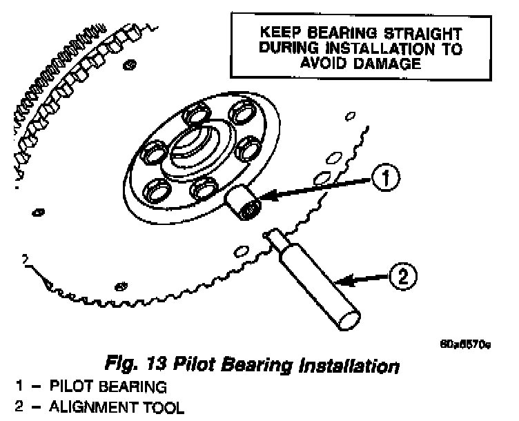 2. Start new bearing into crankshaft by hand. Then seat bearing with clutch alignment tool (Fig. 13).