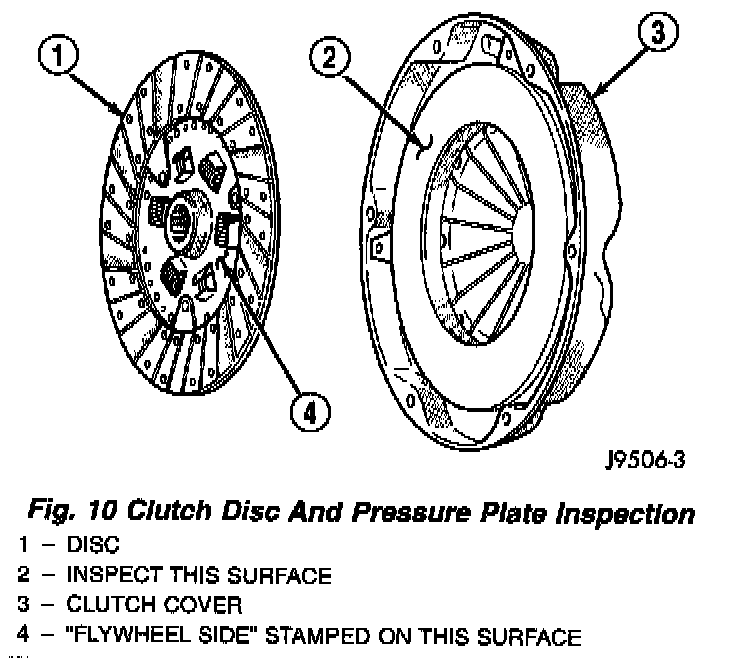 5. Inspect condition of pressure plate surface of clutch cover (Fig. 10). Replace cover if this surface is worn, heat checked, cracked, or scored.