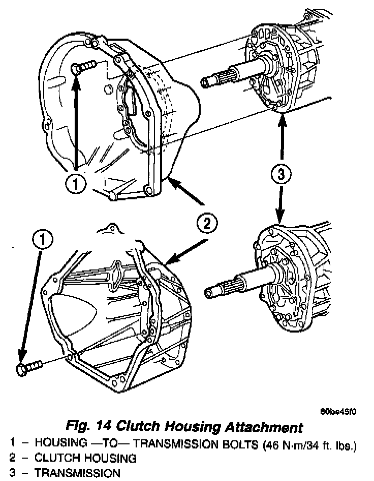 The bolts attaching the housing to the transmission case are located inside the housing (Fig. 14). Recommended tightening torque for the clutch housing-to-transmission bolts is 46 Nm (34 ft. lbs.).