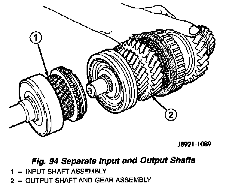 2. Separate input shaft from output shaft (Fig. 94). Note that the output shaft pilot bearing is a non-caged roller type bearing.