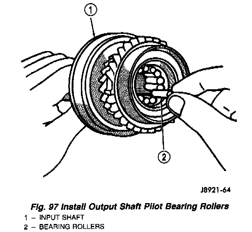 5. Install output shaft pilot bearing rollers in input shaft bore (Fig. 97). Ensure to use sufficient petroleum jelly to hold rollers in position.