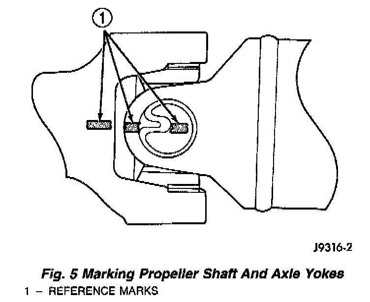 7. Mark rear propeller shaft and rear axle yokes for installation alignment (Fig. 5).