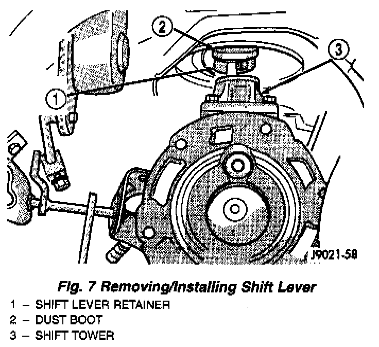 d. Lift lever and retainer out of shift tower (Fig. 7). Do not remove the shift lever from the floor console shifter boots. Leave the lever in place for transmission installation.