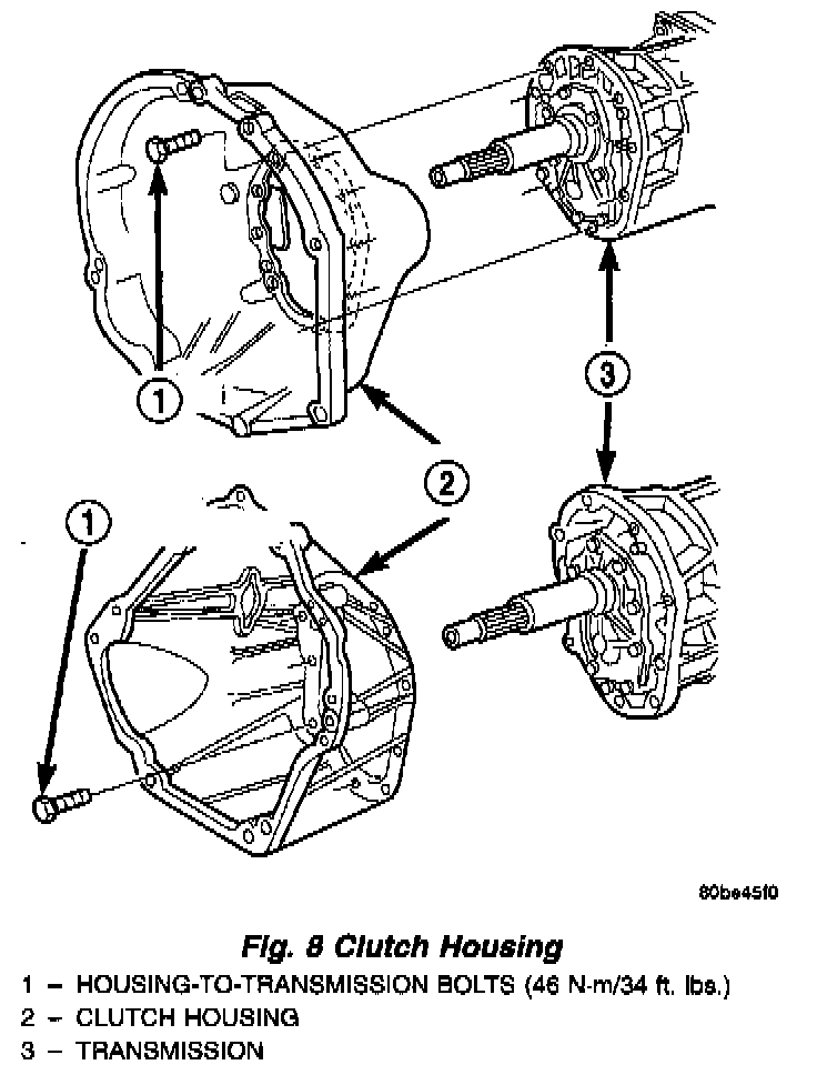 1. Install clutch housing on transmission. Tighten housing bolts to 46 Nm (34 ft. lbs.) torque (Fig. 8).