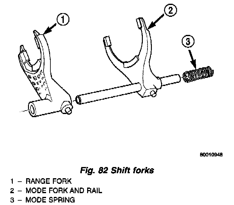 Check condition of the shift forks and mode fork shift rail (Fig. 82). Minor nicks on the shift rail can be smoothed with 32000 grit emery cloth.