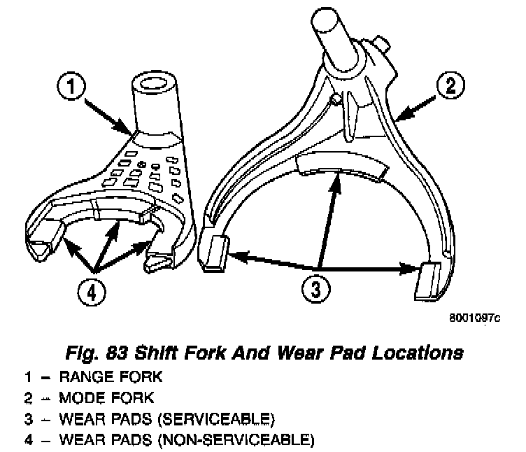 Inspect the shift fork wear pads (Fig. 83). The mode fork pads are serviceable and can be replaced if necessary. The range fork pads are not serviceable. The fork must be replaced as an assembly if the pads are worn or damaged.