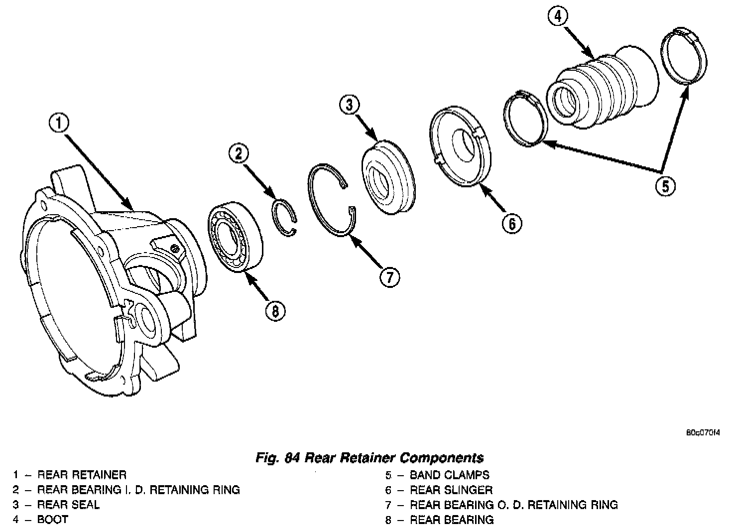 Inspect the retainer components (Fig. 84). Replace the bearing if rough or noisy. Check the retainer for cracks or wear in the bearing bore. Clean the retainer sealing surfaces with a scraper and 3M all purpose cleaner. This will ensure proper adhesion of the sealer during reassembly.