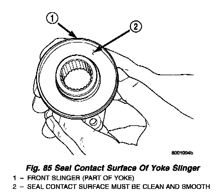 Check condition of the seal contact surfaces of the yoke slinger (Fig. 85). This surface must be clean and smooth to ensure proper seal life. Replace the yoke nut and seal washer as neither part should be reused.