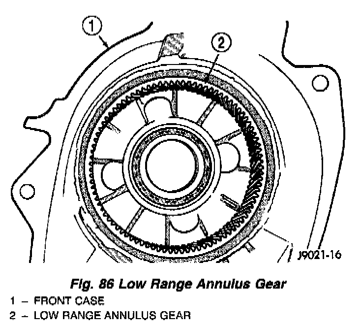 Inspect annulus gear condition carefully. The gear is only serviced as part of the front case. If the gear is damaged, it will be necessary to replace the gear and front case as an assembly. Do not attempt to remove the gear (Fig. 86)