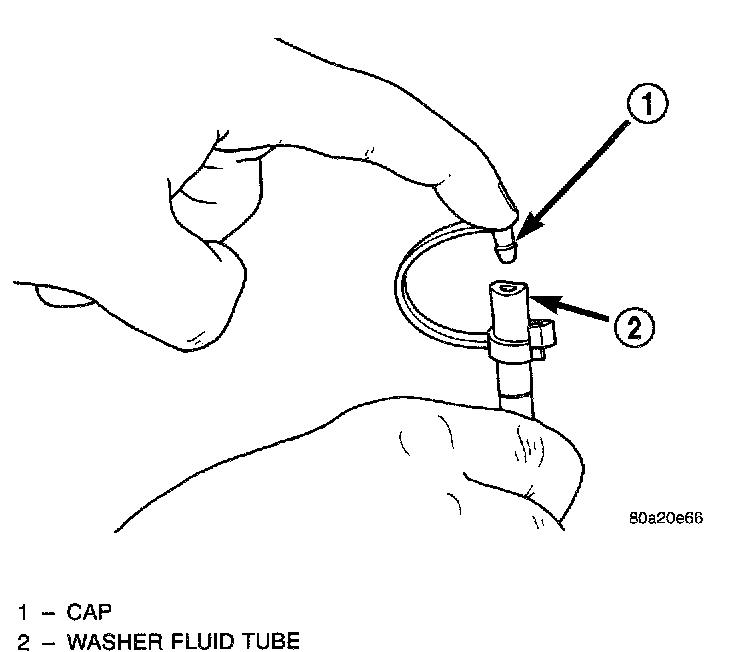 There is also a washer hose cap attached to the hose below the check valve. When the hardtop is removed from the vehicle, the body half of the washer hose must be disconnected from the check valve. The washer hose cap is used to plug the body half of the washer hose after it is disconnected from the check valve.