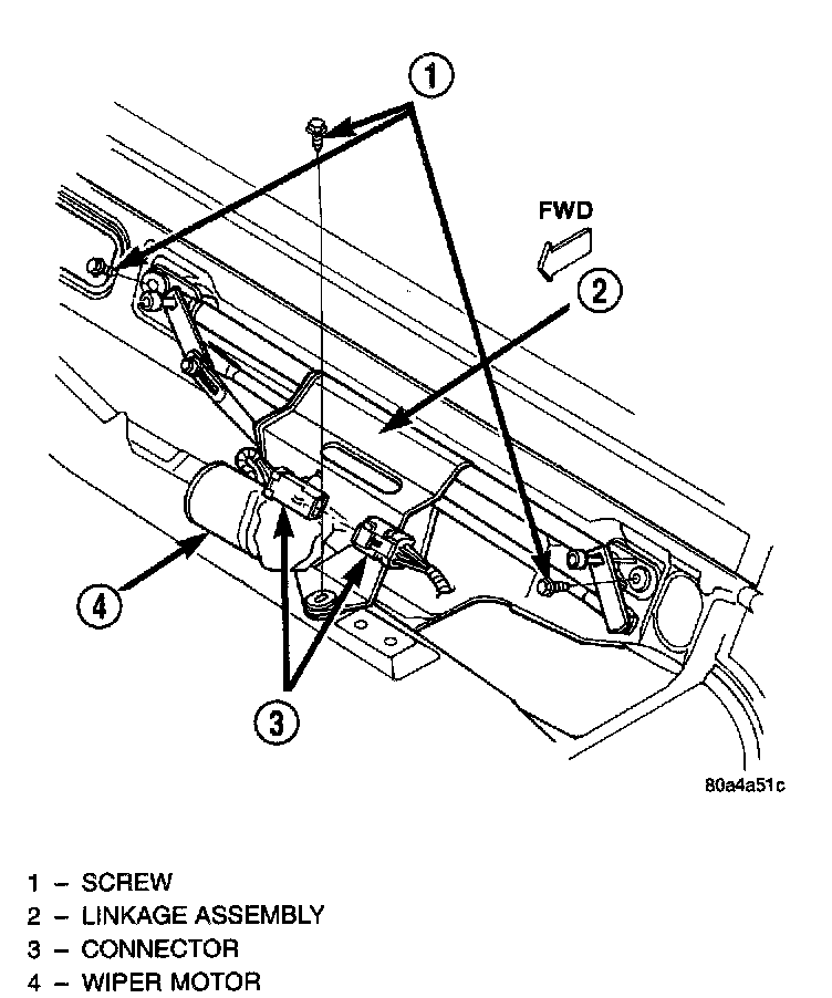 9. Reach into the cowl plenum and unplug the wiper motor wire harness connector.