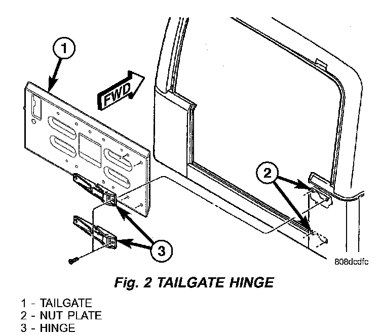 2. Remove the screws attaching the hinge to the body and tailgate (Fig. 2).