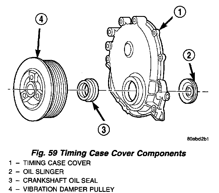 8. Pry the crankshaft oil seal from the front of the timing case cover (Fig. 59).
