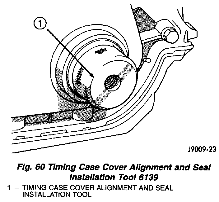 4. Insert Timing Case Cover Alignment and Seal Installation Tool 6139 in the crankshaft opening in the cover (Fig. 60).