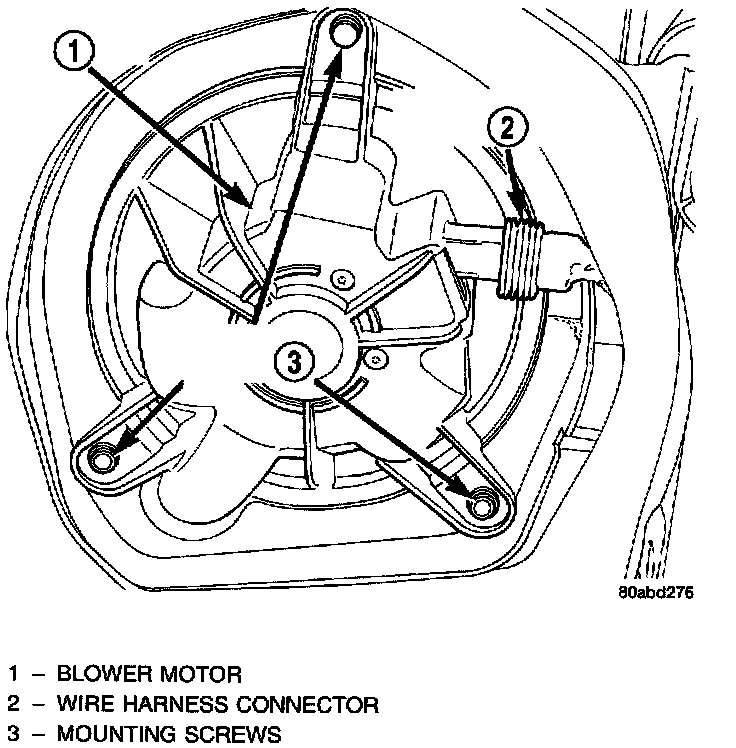 2. Install and tighten the three screws that secure the blower motor and wheel assembly to the heater- A/C housing. Tighten the mounting screws to 2.2 Nm (20 in. lbs.).