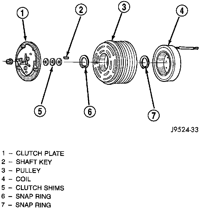 When the clutch coil is energized, it magnetically draws the clutch into contact with the pulley and drives the compressor shaft. When the coil is not energized, the pulley freewheels on the clutch hub bearing, which is part of the pulley. The compressor clutch and coil are the only serviced parts on the compressor.