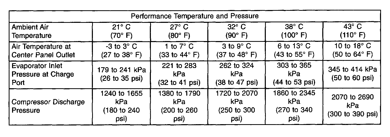 8. Compare the discharge air temperature to the Performance Temperature and Pressure chart. If the discharge air temperature is high, see Refrigerant System Leaks and Refrigerant System Charge.