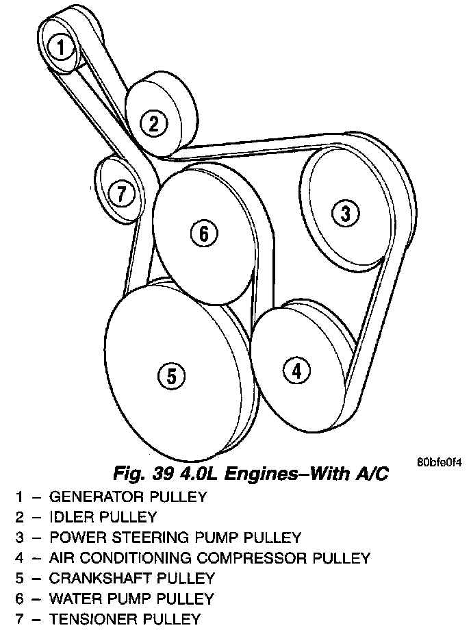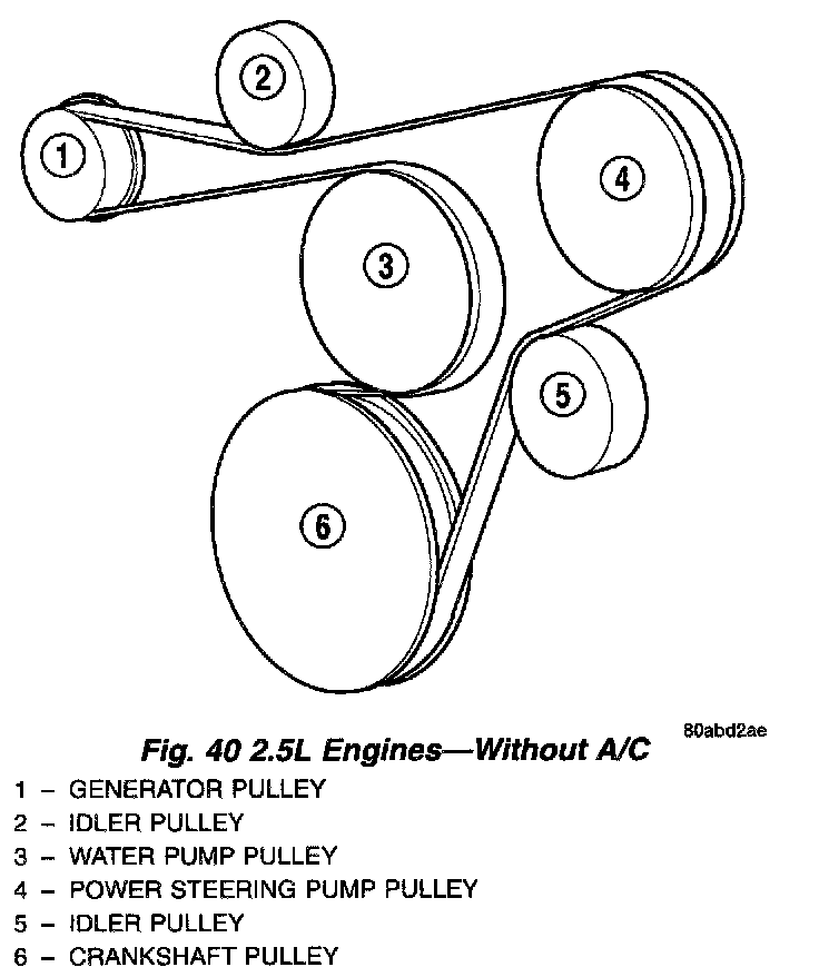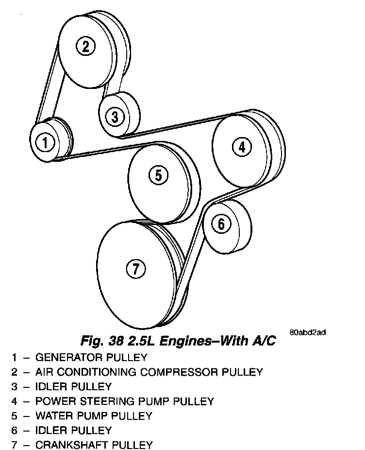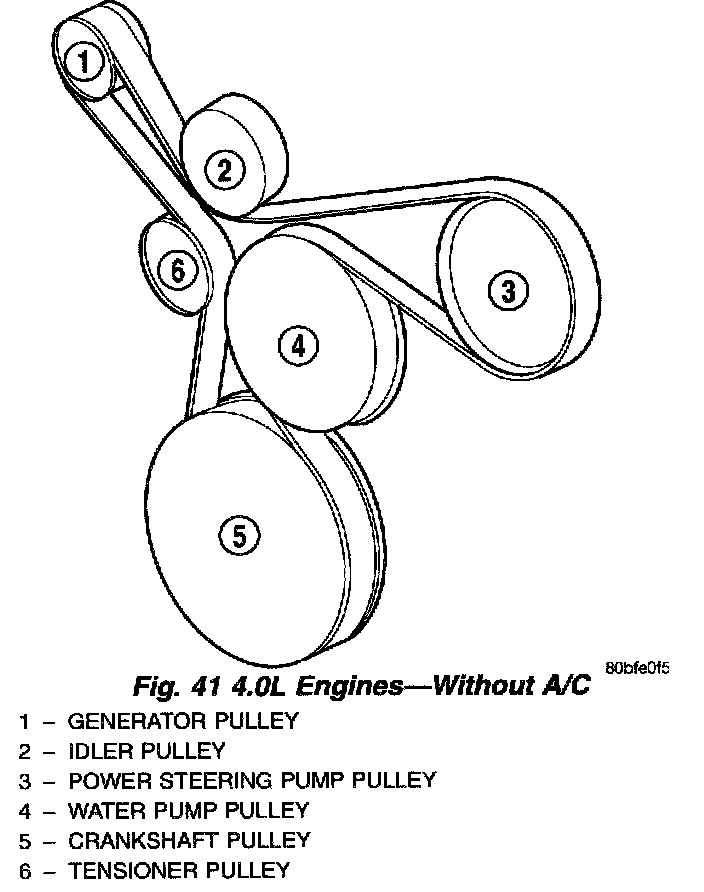 Refer to (Fig. 38) (Fig. 39) (Fig. 40) (Fig. 41) for correct belt routing, or refer to Belt Routing Label located in the vehicle engine compartment.