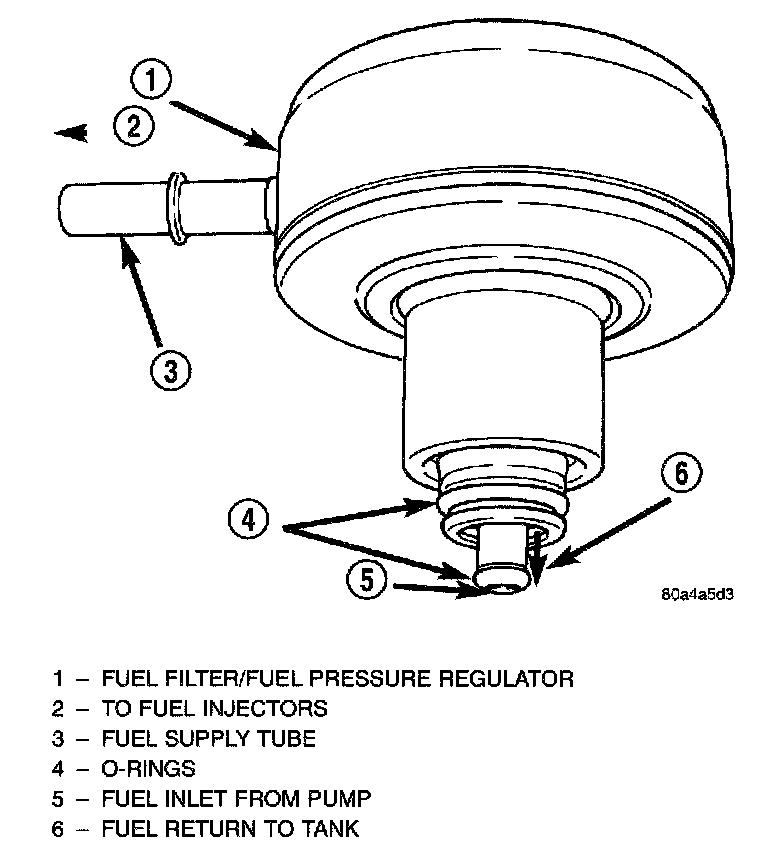Fuel is supplied to the filter/regulator by the electric fuel pump through an opening tube at the bottom of filter/regulator.