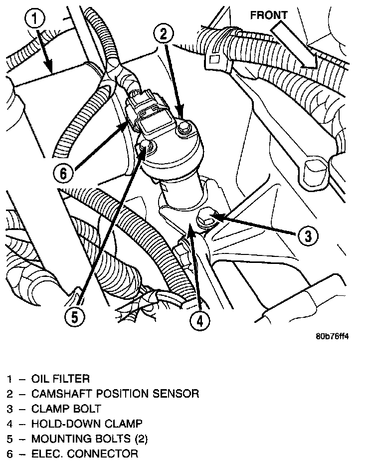 The Camshaft Position Sensor (CMP) is bolted to the top of the oil pump drive shaft assembly. The sensor and drive shaft assembly is located on the right side of the engine near the oil filter.