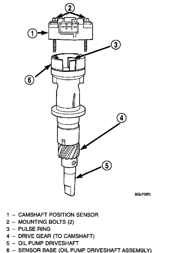 The Camshaft Position Sensor (CMP) on the this engine is bolted to the top of the oil pump drive shaft assembly. The sensor and drive shaft assembly is located on the right side of the engine near the oil filter.