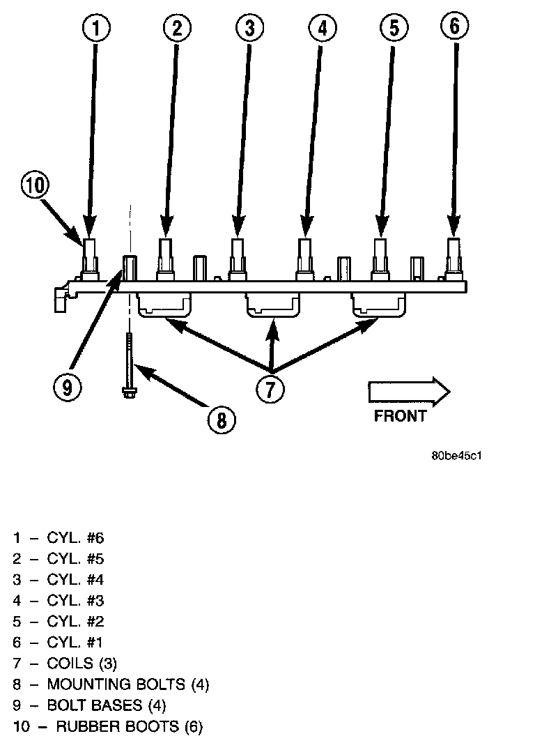 This 6-cylinder engine uses a one-piece coil rail containing three independent coils. Although cylinder firing order is the same as 4.0L engines of previous years, spark plug firing is not. The 3 coils dual-fire the spark plugs on cylinders 1-6, 2-5 and/or 3-4. When one cylinder is being fired (on compression stroke), the spark to the opposite cylinder is being wasted (on exhaust stroke). The one-piece coil bolts directly to the cylinder head. Rubber boots seal the secondary terminal ends of the coils to the top of all 6 spark plugs. One electrical connector (located at the rear end of the coil rail) is used for all three coils.