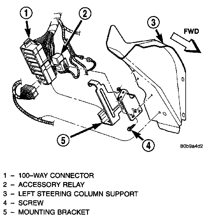 2. Reach up under the instrument panel outboard of the steering column to access the accessory relay and the accessory relay wire harness connector, which is secured to the 100-way wire harness connector mounting bracket.