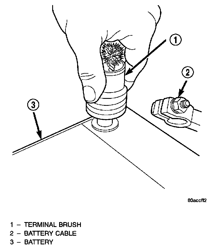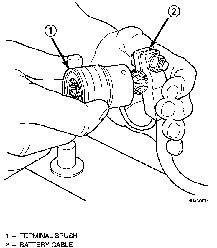 1. Clean the battery cable terminal clamps of all corrosion. Remove any corrosion using a wire brush or a post and terminal cleaning tool, and a sodium bicarbonate (baking soda) and warm water cleaning solution.