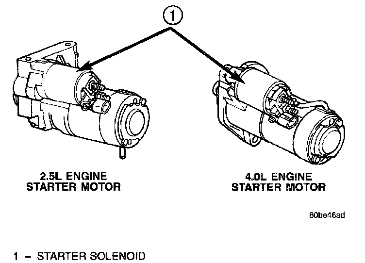 The starter motors used for both the engines available in this model are not interchangeable. However, each of these starter motors incorporates several of the same features to create a reliable, efficient, compact, lightweight and powerful unit. Both starters feature high torque direct current electric motors. Inside both starter motors the commutator of the rotating motor armature is contacted by four brushes. The starter motor for the 2.5L engine is driven by four permanent magnet field poles, while the starter motor for the 4.0L engine is driven by four electromagnetic field coils wound around four pole shoes. The 2.5L starter motor is rated at 1.2 kilowatts (about 1.6 horsepower) output at 12 volts, while the 4.0L starter motor is rated at 1.4 kilowatts (about 1.9 horsepower) output at 12 volts.