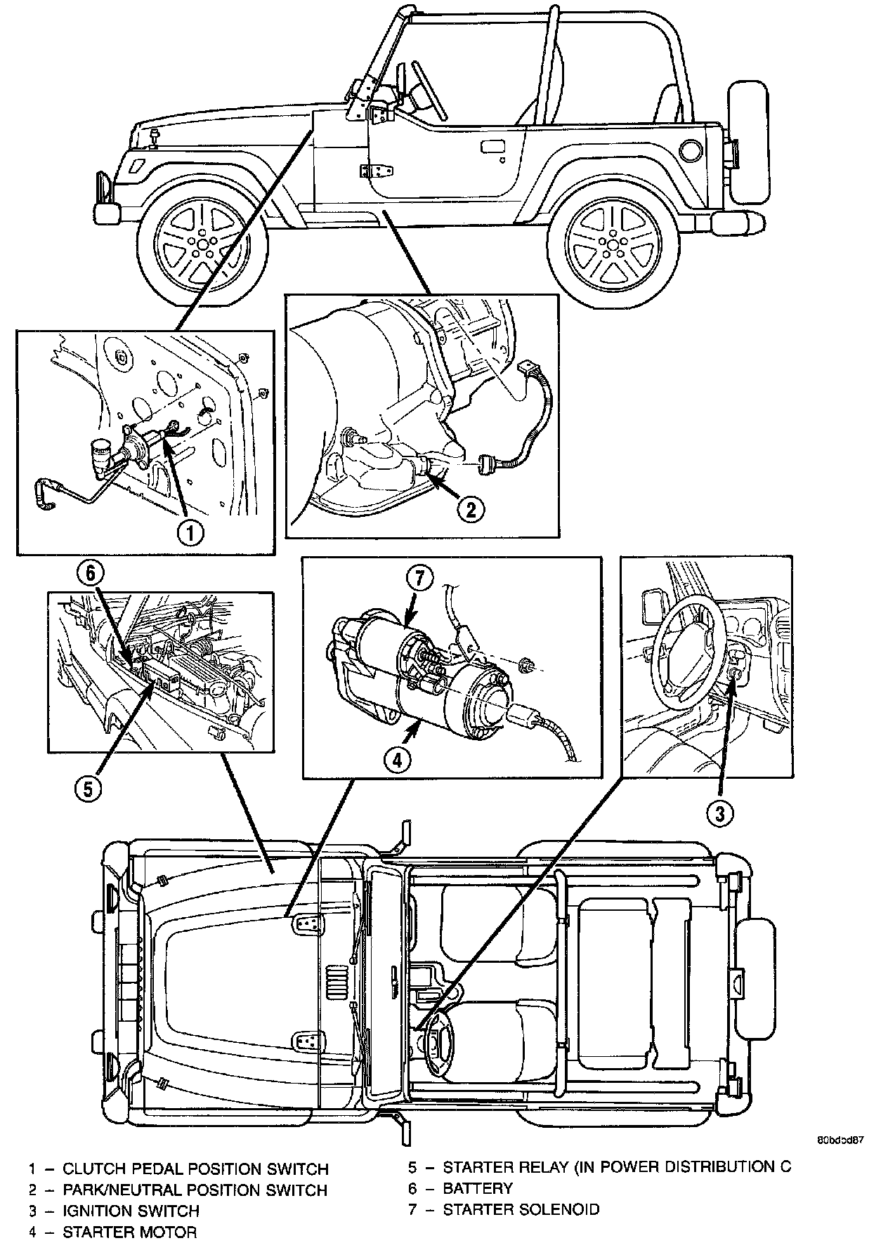 The starting system low-amperage control circuit includes the ignition switch, the clutch pedal position switch (manual transmission), the park/neutral position switch (automatic transmission), the starter relay, the electromagnetic windings of the starter solenoid, and the wire harnesses that connect these components. The following starting system control circuit components are covered in more detail in other areas: