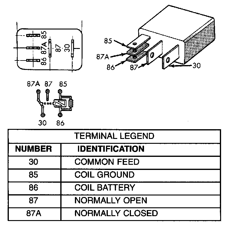 The starter relay is a International Standards Organization (ISO) micro-relay. Relays conforming to the ISO specifications have common physical dimensions, current capacities, terminal patterns, and terminal functions. The ISO micro-relay terminal functions are the same as a conventional ISO relay. However, the ISO micro-relay terminal pattern (or footprint) is different, the current capacity is lower,and the physical dimensions are smaller than those of the conventional ISO relay.
