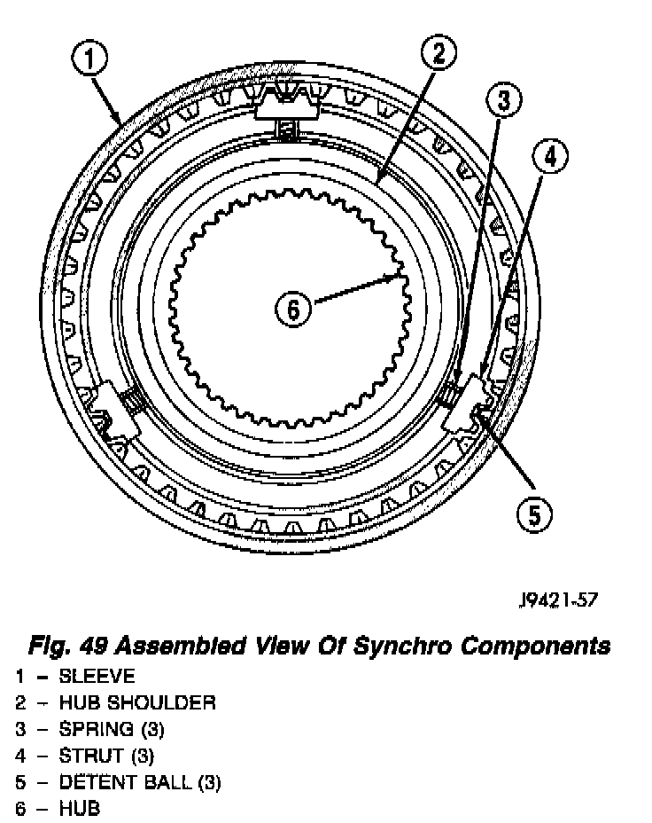 6. Verify synchro assembly. Be sure the three springs, struts and detent balls are all in place (Fig. 49).