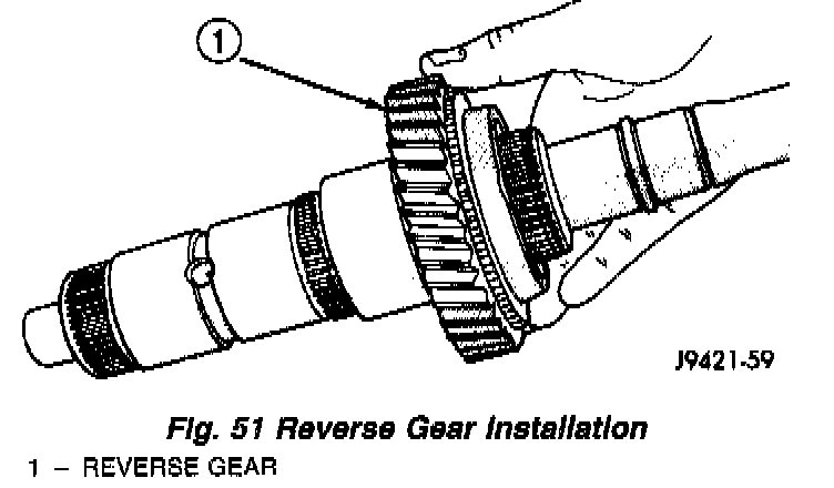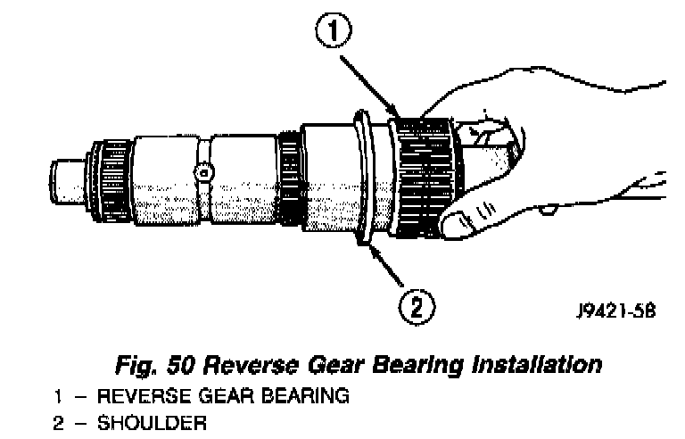 4. Lubricate and install reverse gear needle bearing on shaft (Fig. 50). Slide bearing up against shoulder on output shaft.