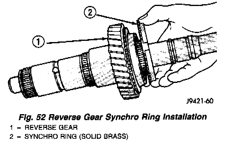 6. Install solid brass synchro ring on reverse gear (Fig. 52).