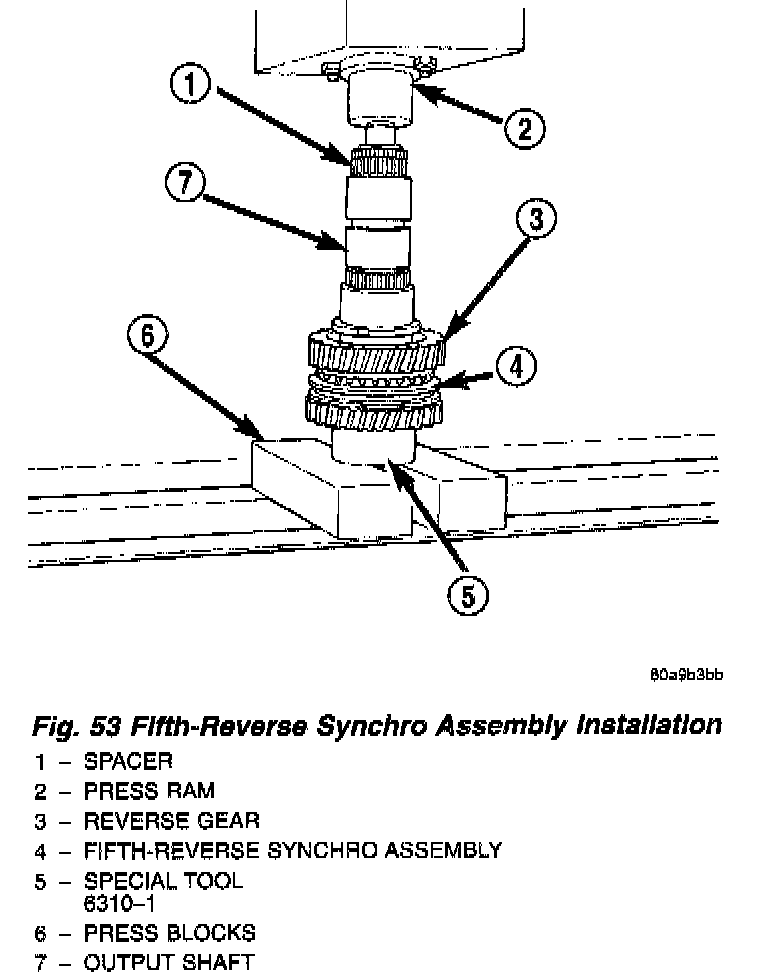 8. Start fifth-reverse synchro assembly on output shaft splines by hand. Then seat synchro onto shaft with shop press and Remover 6310-1 (Fig. 53).