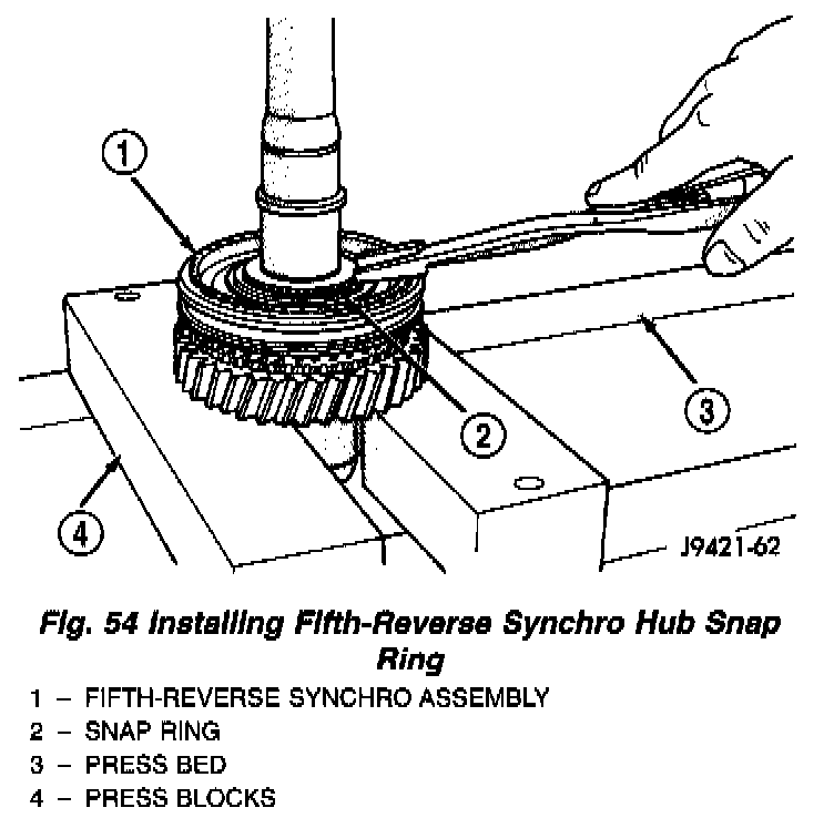 9. Install new fifth-reverse hub snap ring (Fig. 54) as follows: