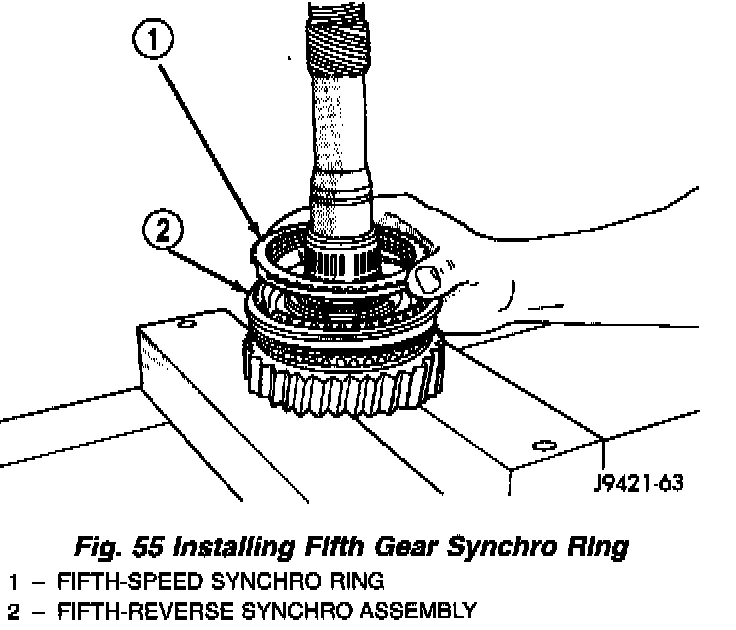 10. Install fifth gear synchro ring in synchro hub and sleeve (Fig. 55).